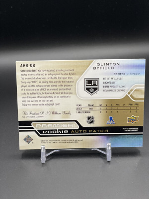 2021-22 Premier Quinton Byfield Gold Horizontal Rookie Patch Auto /25 AHR-QB