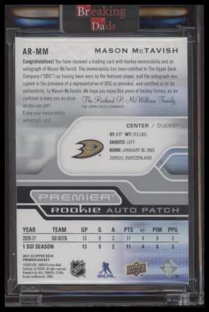 2021 Upper Deck Premier Mason McTavish #AR-MM Rookie Patch Auto #'d /249