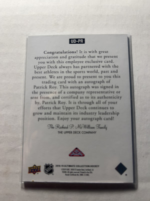 Patrick Roy 2018-19 Ultimate Collection Employee Exclusive Auto