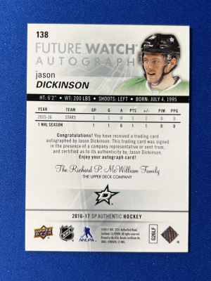 2016-17 SP Authentic Jason Dickinson Future Watch Auto /999 #138