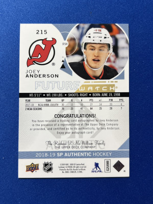 2018-19 SP Authentic Joey Anderson Future Watch Auto /999 #215