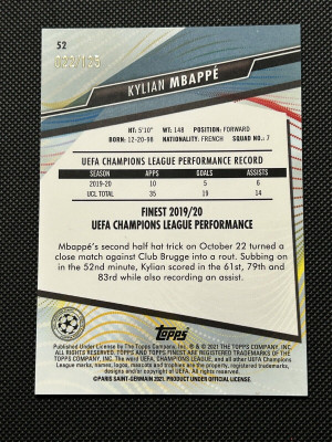 Kylian Mbappe 2020-21 Finest UEFA Champions League Blue Refractor #52 /150 PSG