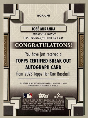 2023 Topps Tier One #BOA-JMI Jose Miranda RC Rookie Breakout Auto Twins /299