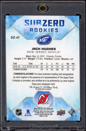 2019 Upper Deck Ice Sub Zero Rookies Auto SZ-47 Jack Hughes