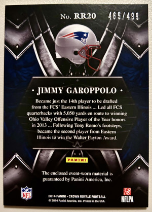 2014 Panini Jimmy Garoppolo Crown Royale Royalty Materials /499 #RR20 Rookie RC