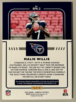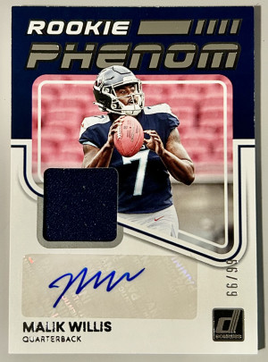 2022 Panini Donruss #RPA-3 MALIK WILLIS RC Auto Jersey Rookie PHENOM Premium /99