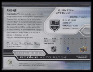 2021 Upper Deck Premier Quinton Byfield #AHR-QB Rookie Patch Auto #'d /99