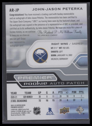 2021 Upper Deck Premier JJ Peterka #AR-JP Rookie Patch Auto #'d /249