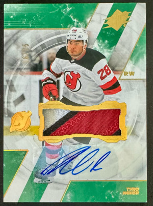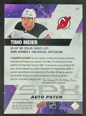 2023-24 SPx Timo Meier Auto Patch /25 (Game Used Patch)