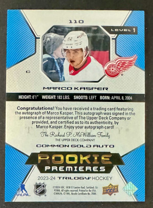 2023-24 Trilogy Marco Kasper Rookie Premieres Auto Level 1 /249