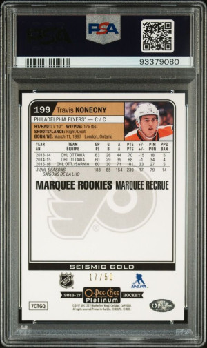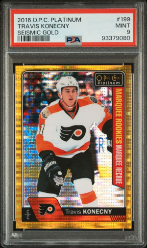 2016-17 O-Pee-Chee-Platinum Seismic Gold Marquee Rookies Travis Konecny #199 17/50 PSA 9