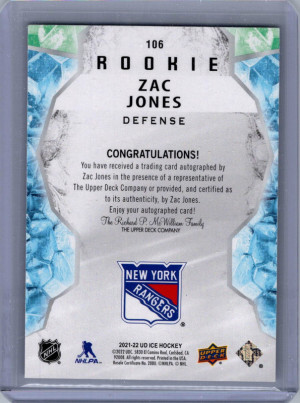 Upper Deck Ice Autographs White Snowflake Zac Jones #106 RC Auto