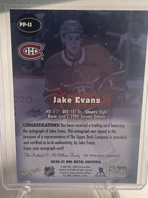 2020-21 Skybox Metal Universe Jake Evans PP-11 Premium Prospects RC Auto Ruby
