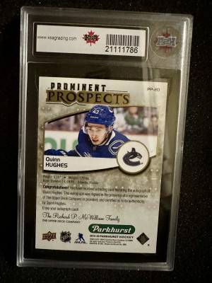 2019-20 U.D. PARKHURST #PP-20 QUINN HUGHES AUTO ROOKIE CARD
