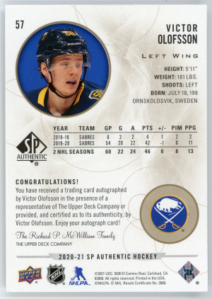 2020-21 SP Authentic #57 Victor Olofsson Limited Autograph