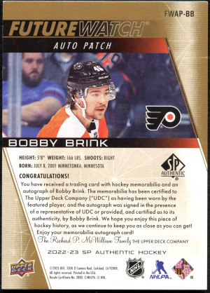 2022 SP Authentic Future Watch Auto Patch Bobby Brink RC /100
