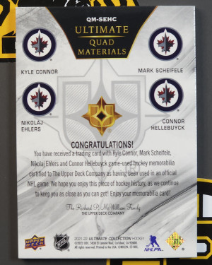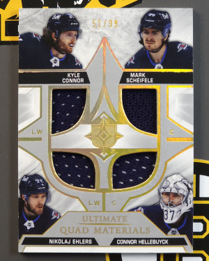 2021-22 Ultimate Quad Materials Game Used /99 Hellebuyck Connor Scheifele Ehlers