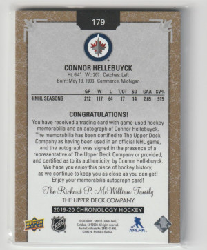 Upper Deck Chronology Gold Premium Connor Hellebuyck #179 Auto Patch 19/25