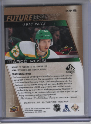 2022-23 SP Authentic Future Watch Auto Patch Marco Rossi Rookie Auto /100
