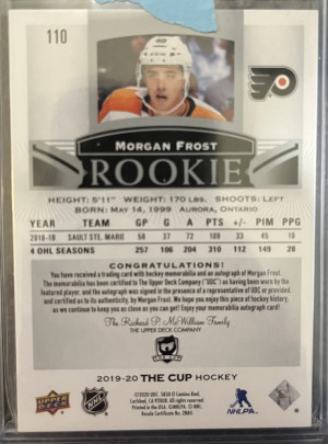 Morgan Frost 2019-20 UD The Cup Rookie Patch Auto RPA