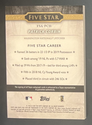 2021 Topps Five Star Patrick Corbin Purple Auto /50