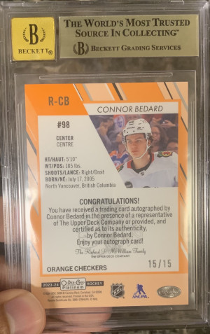 2023-24 Upper Deck OPC Platinum CONNOR BEDARD Orange Checkers Auto/15 BGS 9.5/10