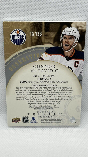 Connor MCDavid 2022-23 Upper Deck Trilogy #TG-13B PATCH AUTO /15