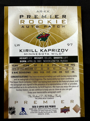 Kirill Kaprizov Premier Rookie Patch Auto Gold Acetate /35