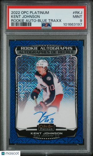 Kent Johnson 2022 O-Pee-Chee Platinum Rookie Auto Blue Traxx PSA 9