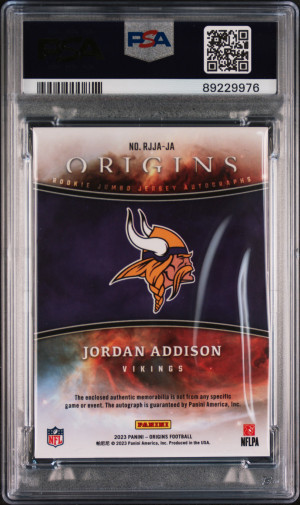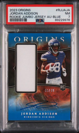 2023 Panini Origins Rookie Jumbo Jersey Autographs Jordan Addison Rookie Jumbo Jersey Au-Blue