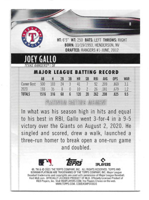 2021 Bowman Platinum Foilboard #8 Joey Gallo - Texas Rangers #089/299