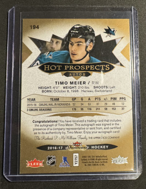 2016-17 Fleer Showcase Timo Meier Hot Prospects Auto /499