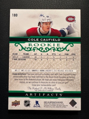 2021-22 Artifacts - Cole Caufield - Dual Jersey patch /99
