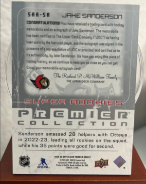 2022-23 Upper Deck Premier Jake Sanderson #SRA-SA Super Rookies /99 Patch