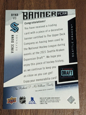 2023-24 SP Game Used Vince Dunn Banner Year - Seattle Kraken Expansion Draft