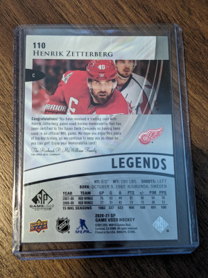 Henrik Zetterberg sp game used jersey Hall of Fame 2020-21 legends