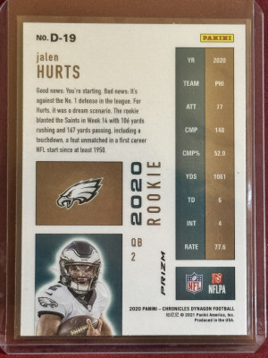2020 Panini Chronicles Jalen Hurts #D-19 Silver Rookie Dynagon Prizm