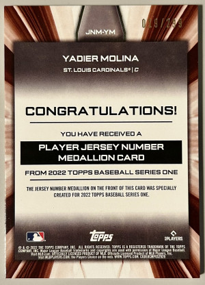 2022 Topps Yadier Molina Black /299 Number Medallion #JNM-YM St. Louis Cardinals