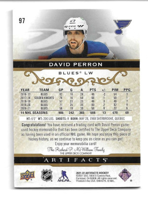 2021-22 Artifacts Materials Gold #97 David Perron - St. Louis Blues (#139/249) (Game Used Jersey)