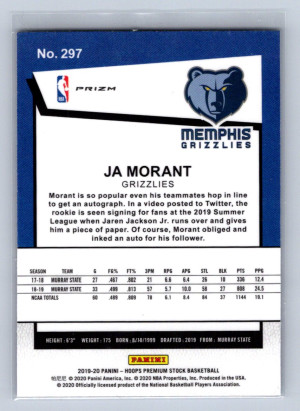 2019-20 Panini NBA Hoops Tribute Ja Morant Premium Stock Blue Cracked Ice #297