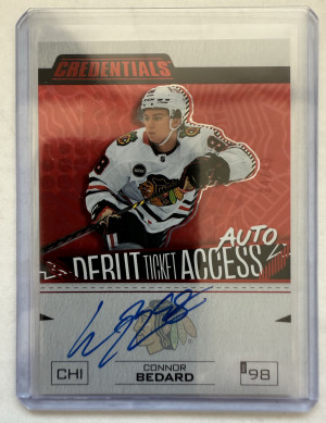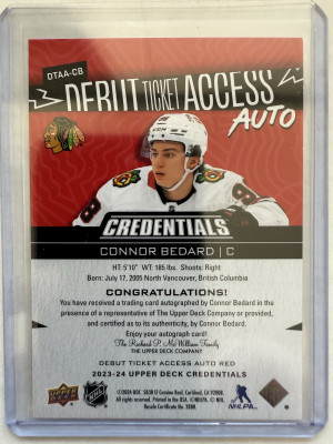 2023-24 Credentials Connor Bedard Debut Ticket Access Auto Red #24/49