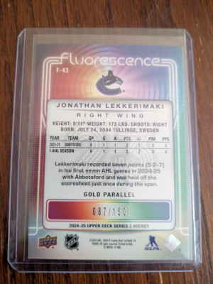 2024-25 Upper Deck Series 2 Jonathan Lekkerimaki Fluorescence Gold Numbered 87/150