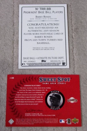 (2) Barry Bonds Pants & Jersey Relics 2005 Topps & 2001 Sweet Spot