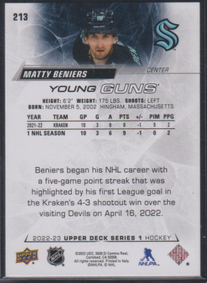 Matty Beniers 2022-23 Upper Deck Series One Young Guns