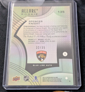 2021-22 Upper Deck Allure Hockey Spencer Knight Blue Line Rookie Auto /35