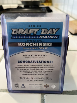 Kevin Korchinski 2023-24 SP Game Used Draft Day Marks “O” #32/35