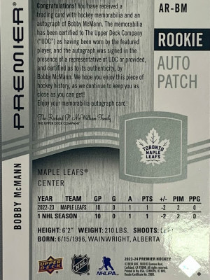 Bobby Mcmann Premier Rookie Patch Auto /249