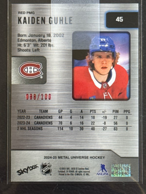 Kaiden Guhle 45 Precious Metal Gems Red #088/100 2024-25 Metal Universe Hockey PMG