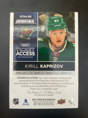 2020-21 Upper Deck Credentials Kirill Kaprizov Debut Ticket Access Autograph /99