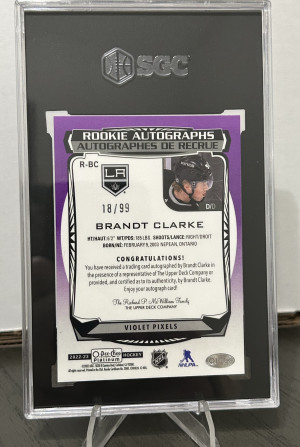 22-23 O-Pee-Chee Platinum Brandt Clarke Violet Pixels Rookie Auto /99 Graded SGC 9